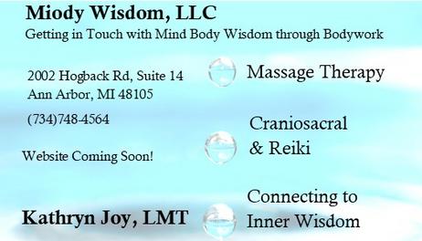 Let Miody Wisdom help you let go of the past and current life stressors by connecting your Mind Body Wisdom through Massage, Craniosacral Therapy, Reiki and more. These are all powerful tools which promote finding your center, bringing about a sense of relaxation, peace, and calm.